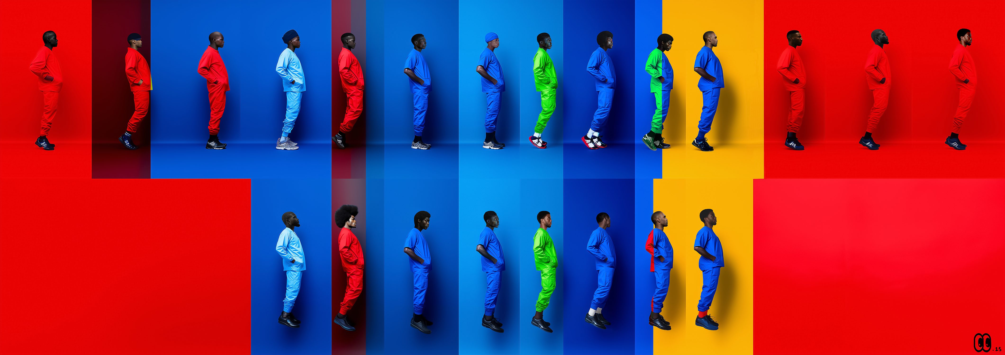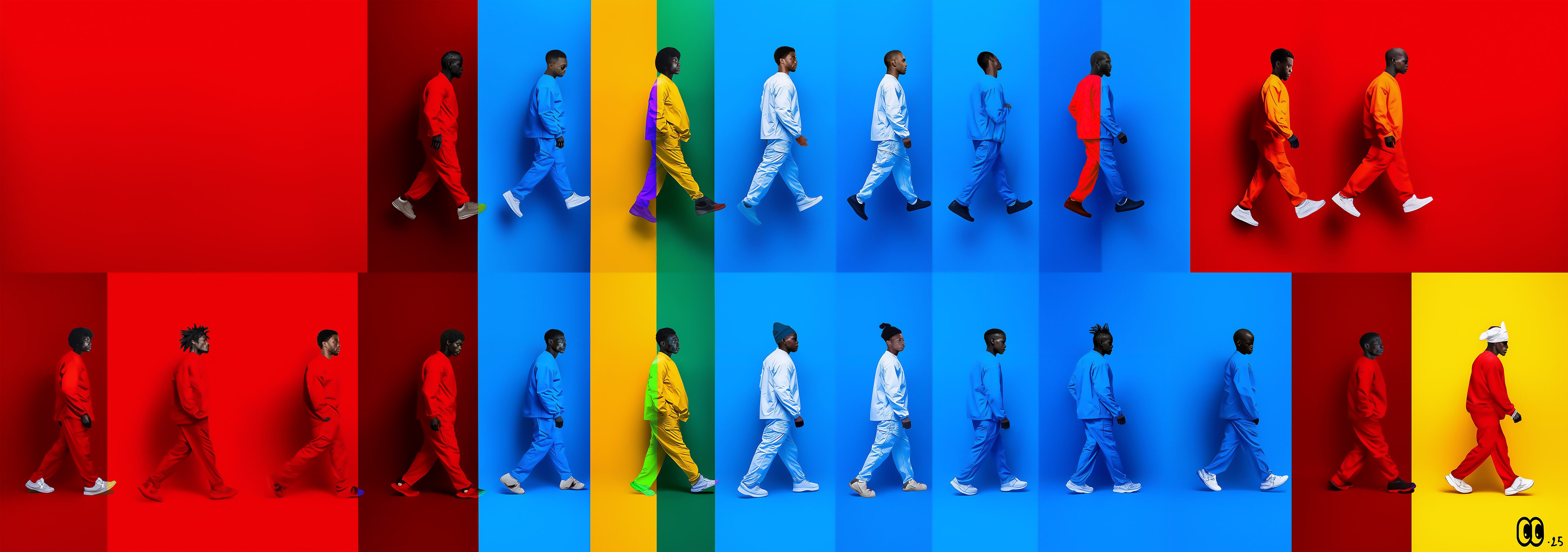 Leaps of time is a digital series shaped by rhythm, movement, and the experience of time. Each figure advances through a colored space functioning like a visual code, almost like a score where every hue marks a beat. Through this structure, color becomes language, and walking becomes a measure of passing time.